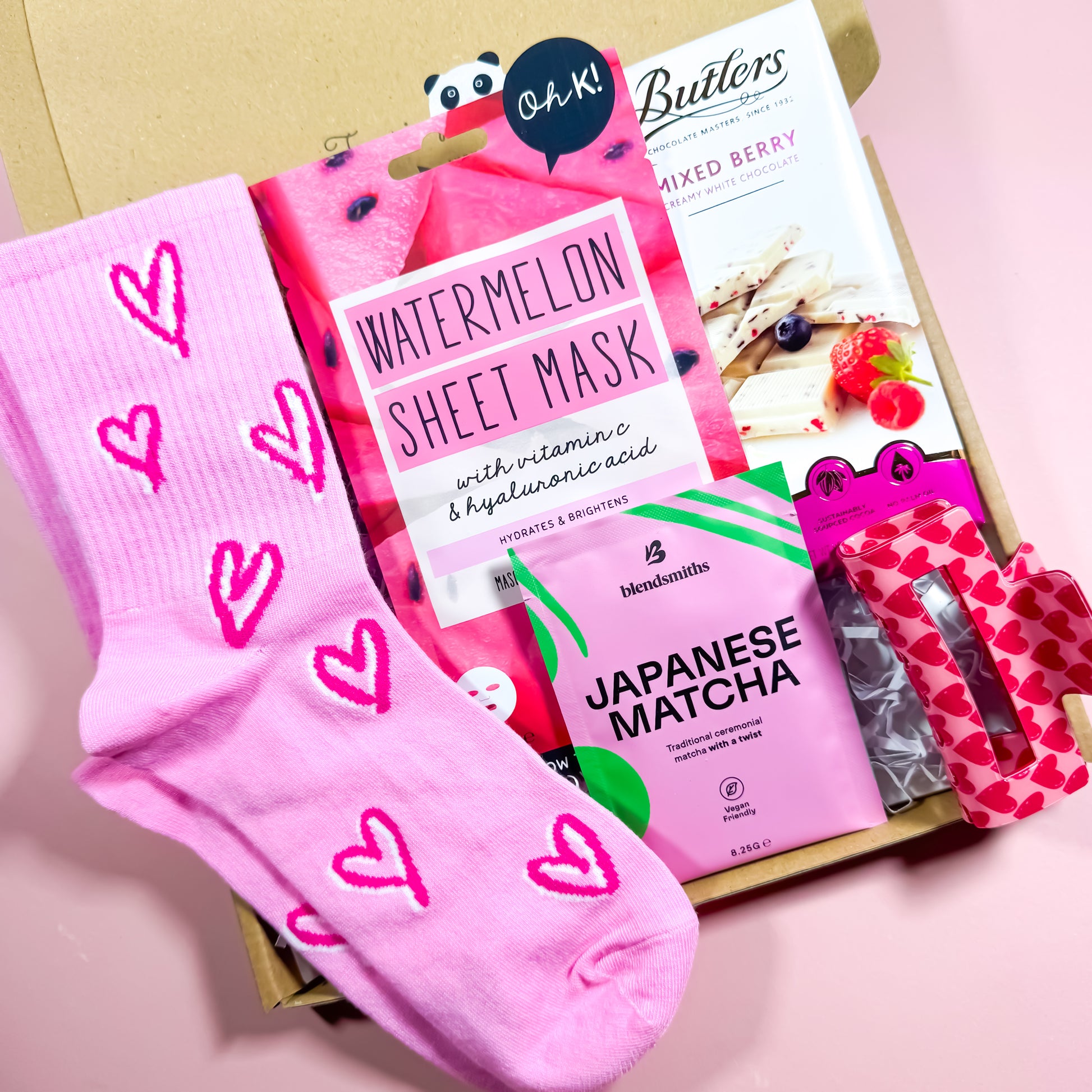 Inside, you’ll find a cosy mix of feel-good treats, from heart-print socks and a hydrating sheet mask, to creamy Irish chocolate and ceremonial-grade Japanese matcha. Finished with a heart-print claw clip, this box is both practical and beautiful.