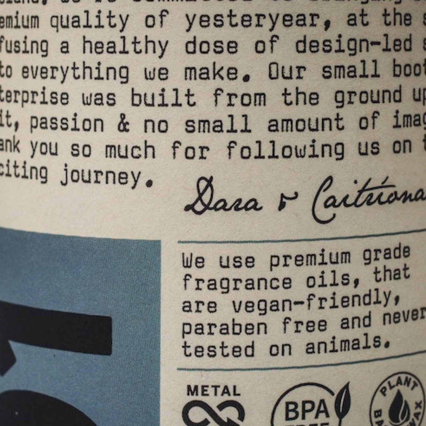 Hand-poured on the west coast, Ireland. We use premium grade fragrance oils, that are vegan-friendly, paraben-free, and never tested on animals. We've deliberately printed on matt paper stickers to avoid the use of unsustainable vinyl or plastic.