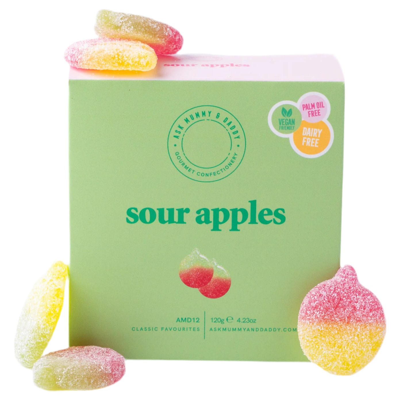 The Sour Apples Gift Box from Ask Mummy & Daddy is a delightful vegan-friendly treat, perfect for gifting or indulging yourself. Presented in a 120g box, these sweets are crafted without palm oil and come in fully biodegradable packaging, reflecting the brand's commitment to sustainability. This is the perfect addition for any care box.