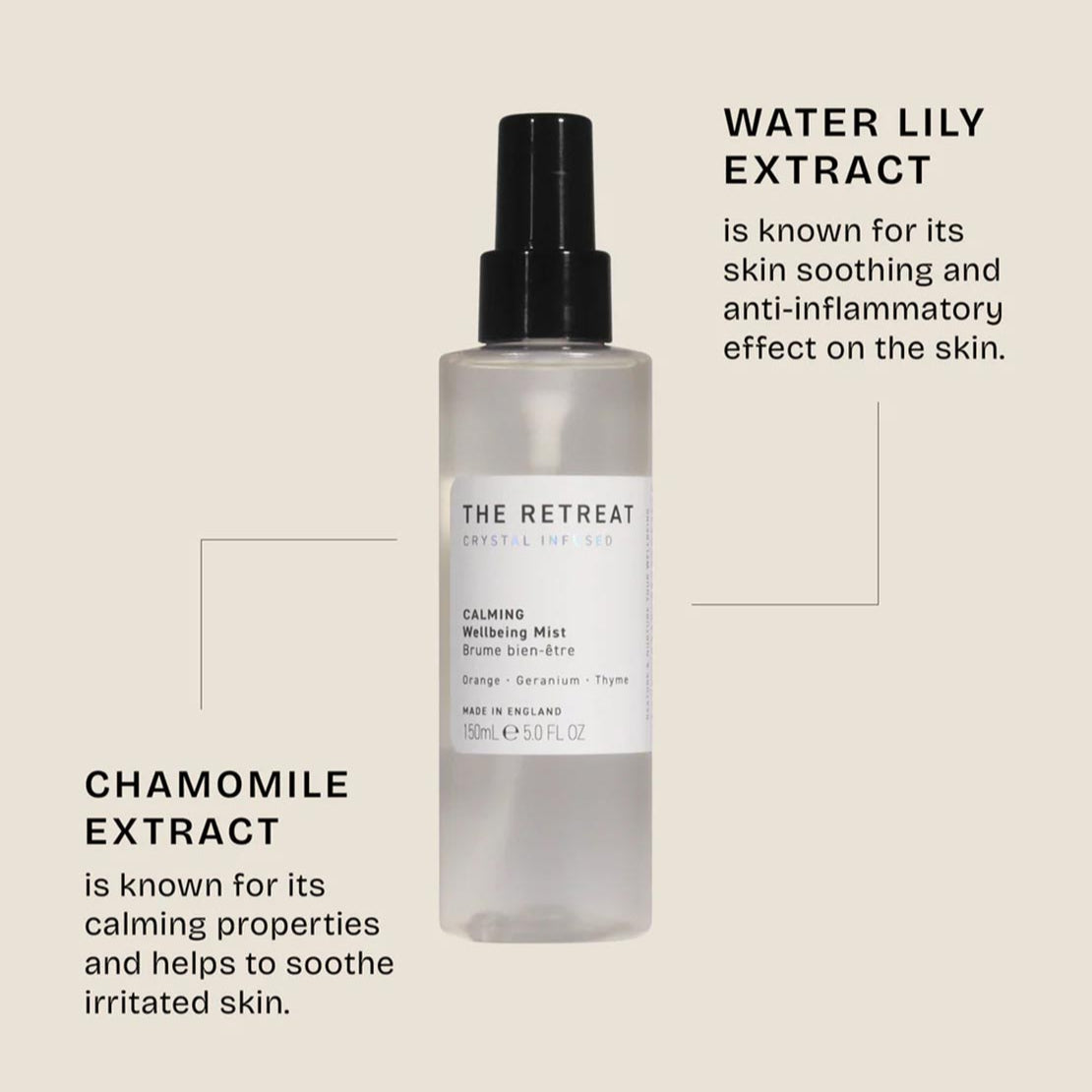 Experience a moment of calm and rejuvenation with The Retreat Energising Well-Being Mist. This light, refreshing spray combines Chamomile and Water Lily extracts to soothe your skin while calming your mind. Infused with a unique blend of 10 essential oils and our Rose & Clear Quartz Crystal Blend, it uplifts your mood and restores balance, transporting you instantly to a luxury spa. Perfect for enhancing your wellbeing and promoting positive energy throughout your day.